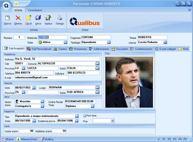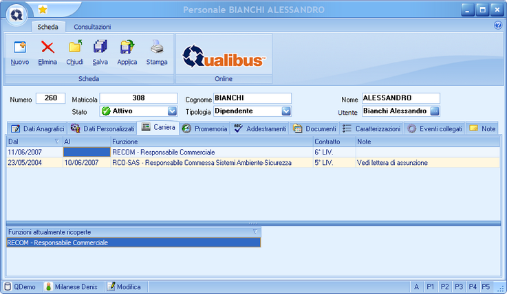 Utente: permette di associare (univocamente) il dipendente ad un utente di Qualibus al nominativo del personale. Gli utenti di Qualibus sono definiti dall'amministratore in APPLICATIONS MANAGER - Utenti