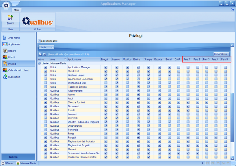 Nella sezione si assegnano i Privilegi particolari attivando i flag in corrispondenza delle funzioni denominate Pers1, Pers2, Pers3, Pers4 e Pers5. L'attivazione delle opzioni Pers è significativa solo nelle applicazioni sottoelencate e comunque presuppone l'attivazione del privilegio su Esegui.