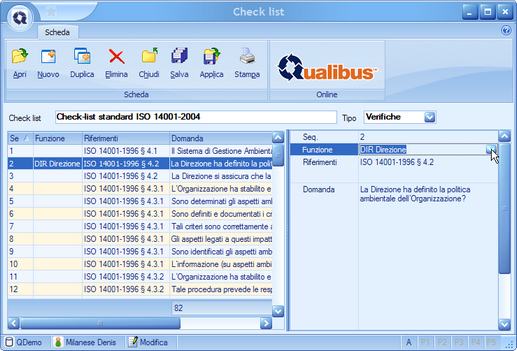 Il programma consente la creazione di check list utilizzabili nelle applicazioni Audit, Riunioni e Progetti di Qualibus oppure come check list a sè stanti.