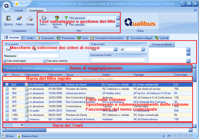 | ► | La barra del filtro rapido (attivabile con il comando F4 sulla tastiera) |