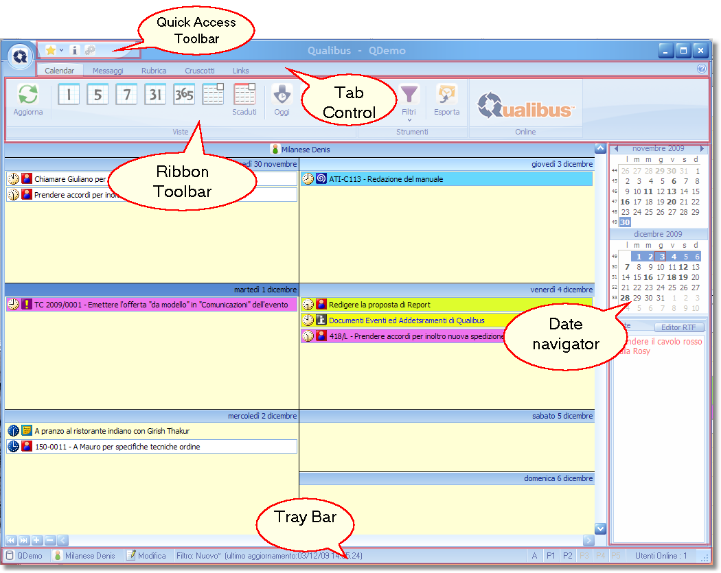 Calendar si avvia in automatico all'accesso a Qualibus, presenta un interfaccia tipo Outlook e mostra gli impegni dell'utente indicandone l'orario di esecuzione (orologio), il tipo di impegno (icona), il processo da cui esso deriva (sfondo della riga) e un'anteprima della descrizione.
