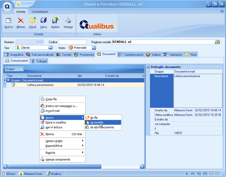 Una volta preparati i Modelli possono essere richiamati da una serie di applicazioni di Qualibus dalla rispettive sezione Documenti-Comunicazioni.