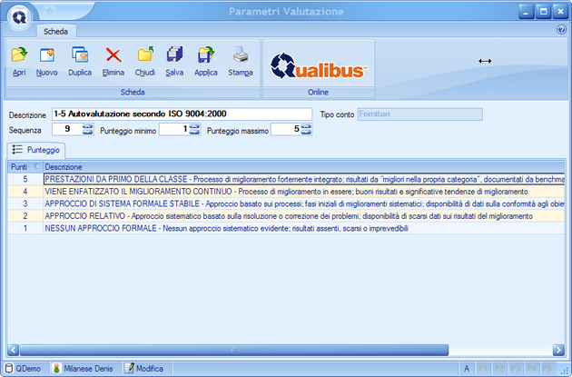 In Parametri Valutazione sono definiti i criteri ed i punteggi da utilizzare in fase di valutazione: in essi vengono specificate le modalità di come si intende valutare uno determinato aspetto relativo al cliente / fornitore. Possono essere definiti Parametri di valutazione quali ad esempio:
