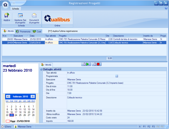 Permette agli utenti Qualibus di effettuare tutte le registrazioni relative ai Progetti / Commesse inserendo Ore ed Attività eseguite, Promemoria, Costi, Documenti, avviare e chiudere Fasi ed implementare le Check list collegate alle fasi, senza entrare nella scheda del Progetto.