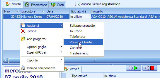 Registrazione progetti contiene le tab Attività, Promemoria e Costi che permettono alle Interfacce di inserire le relative registrazioni. Utenti con privilegi personalizzati sull'applicazione possono inserire registrazioni anche per conto di altri membri del personale.