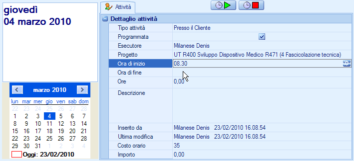 La scheda contiene, nella parte centrale, una griglia orizzontale di inserimento delle registrazioni dove sono attive le funzionalità del menu contestuale e, nella parte inferiore, il calendario e la griglia verticale di dettaglio dove vengono inserite le Ore, l'eventuale Descrizione, gli orari di inizio e fine, ecc. |