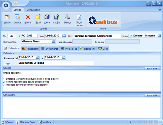 A ciascuna riga del programma può essere associata una check list. Le domande della check list vengono composte manualmente o selezionate tra quelle presenti nell'applicazione CHECK LIST di Qualibus e definite di tipo Riunione nella sezione delle informazione generali. |