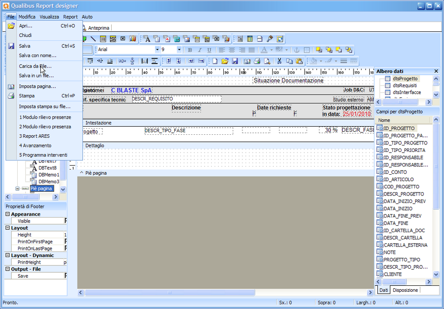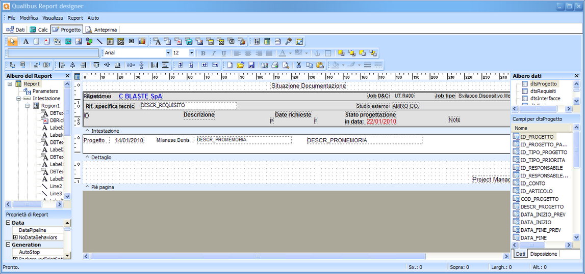 Nella sezione Progetto si imposta il modello di stampa immettendo nelle varie sezioni del documento i campi label e i campi caricati dalla base dati relativa all'applicativo (nel caso illustrato Progetti e commesse) o all'applicativo ad esso collegato.