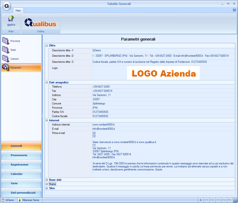 | ► | Parametri: contiene i parametri generali propri dell'organizzazione, quali ad es. il logo e dati anagrafici, ed altre utili impostazioni che sono alla base di alcune funzionalità delle applicazioni di Qualibus |