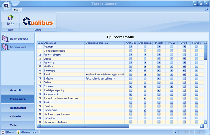 Per aggiungere un nuovo Promemoria, richiamare Aggiungi dal Menù contestuale: nominare il promemoria in Descrizione ed attivare il "flag" in corrispondenza dell'applicativo in cui si desidera renderlo disponibile.