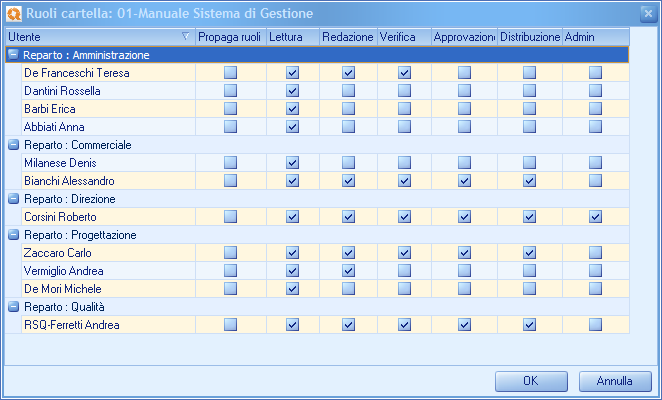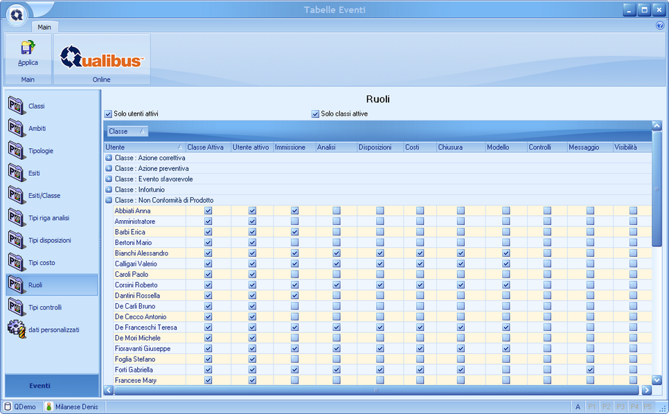 Gli utenti accedono agli applicativi di Qualibus in conformità dei Privilegi e dei Ruoli che vengono loro assegnati da un utente in possesso delle autorità piene sul programma.