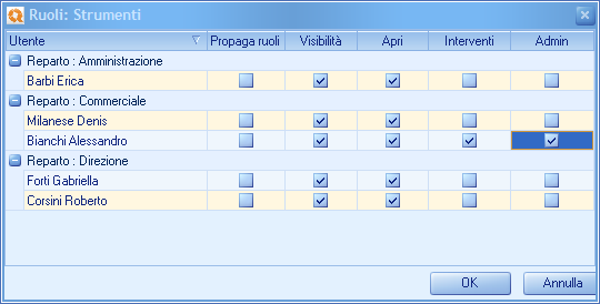 Con la definizione dei Ruoli, in alcune applicazioni di Qualibus c'è la possibilità di aumentare ed affinare il controllo dato dai privilegi generali assegnati in APPLICATIONS MANAGER - Privilegi. Le applicazioni in cui è possibile assegnare i Ruoli sono: Documenti, Scadenzari Infrastrutture e Strumenti, Eventi, e Progetti.